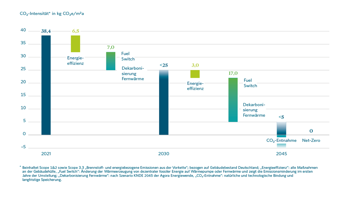 Vonovia hat sich das langfristige Ziel gesetzt, bis zum Jahr 2045 einen treibhausgasneutralen Gebäudebestand mit einer CO2-Intensität von unter 5 kg CO2e pro m2 Mietfläche und Jahr zu erreichen (bezogen auf Scope 1, 2 und 3.3).