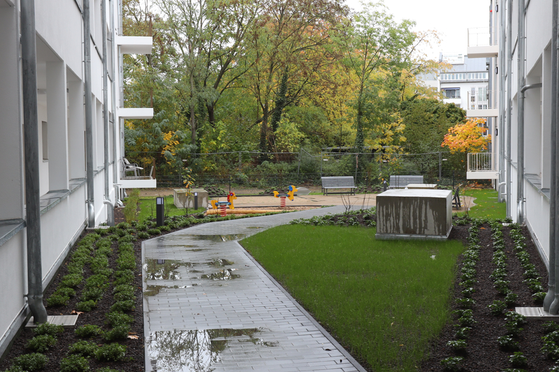 Die geschlossene Blockrandbebauung schirmt den begrünten Innenhof wirkungsvoll von Verkehrsgeräuschen ab und schafft so einen ruhigen Ort für Begegnung und Erholung. Aufzüge in allen Häusern, großzügige Kinderwagenräume sowie vier Fahrradräume erleichtern den Alltag. Barrierearme Zugänge sowie ein zusätzlicher Rampen- und Lastenaufzug sorgen zudem für Erleichterung – ein Plus für Menschen mit eingeschränkter Mobilität oder größere Transportaufgaben.