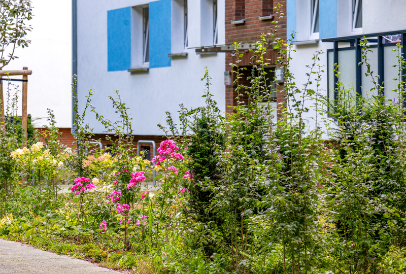 Farbenprächtig gestaltet: Neue Grünflächen und bepflanzte Vorgärten bringen Frische ins Quartier.